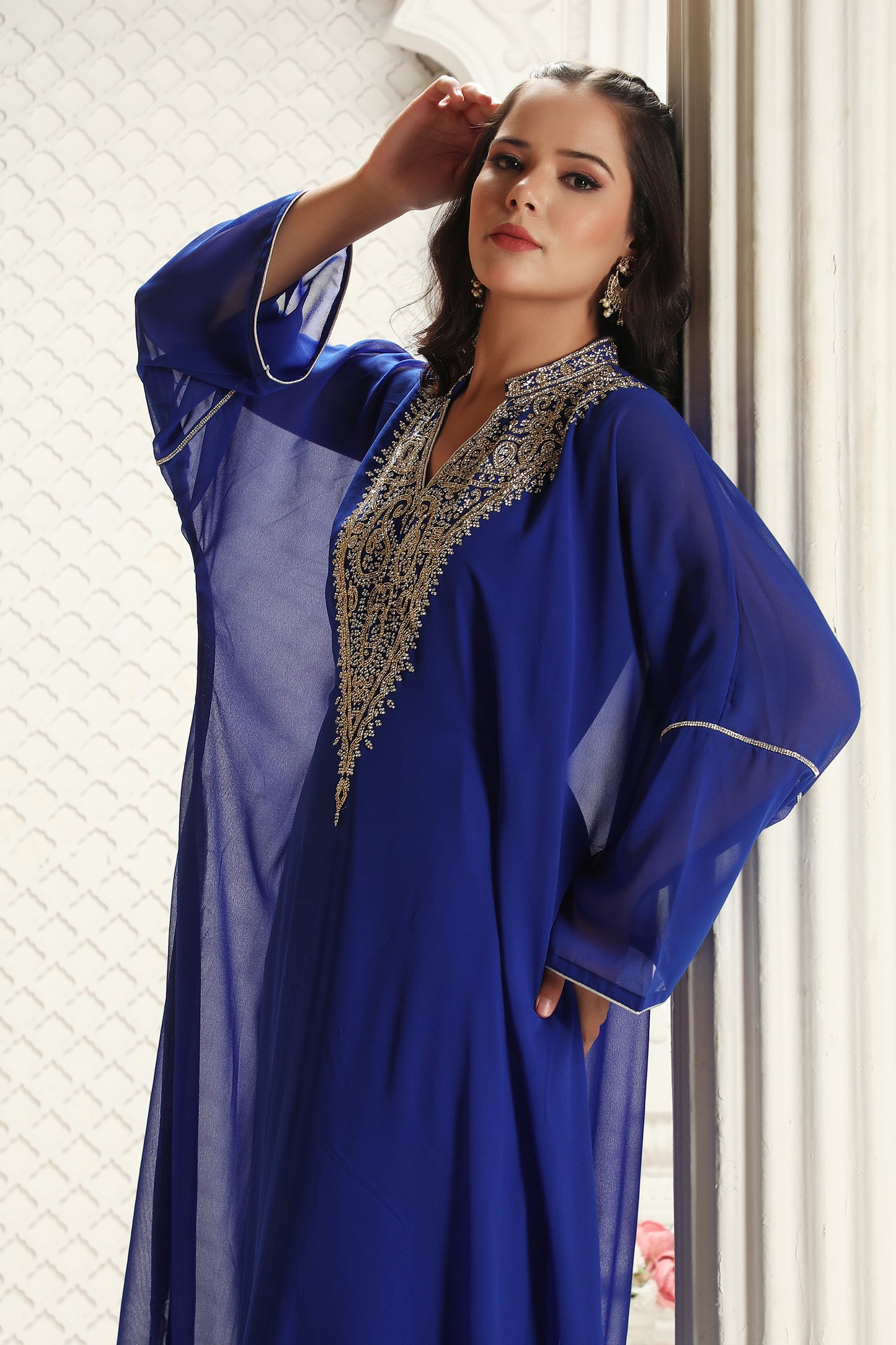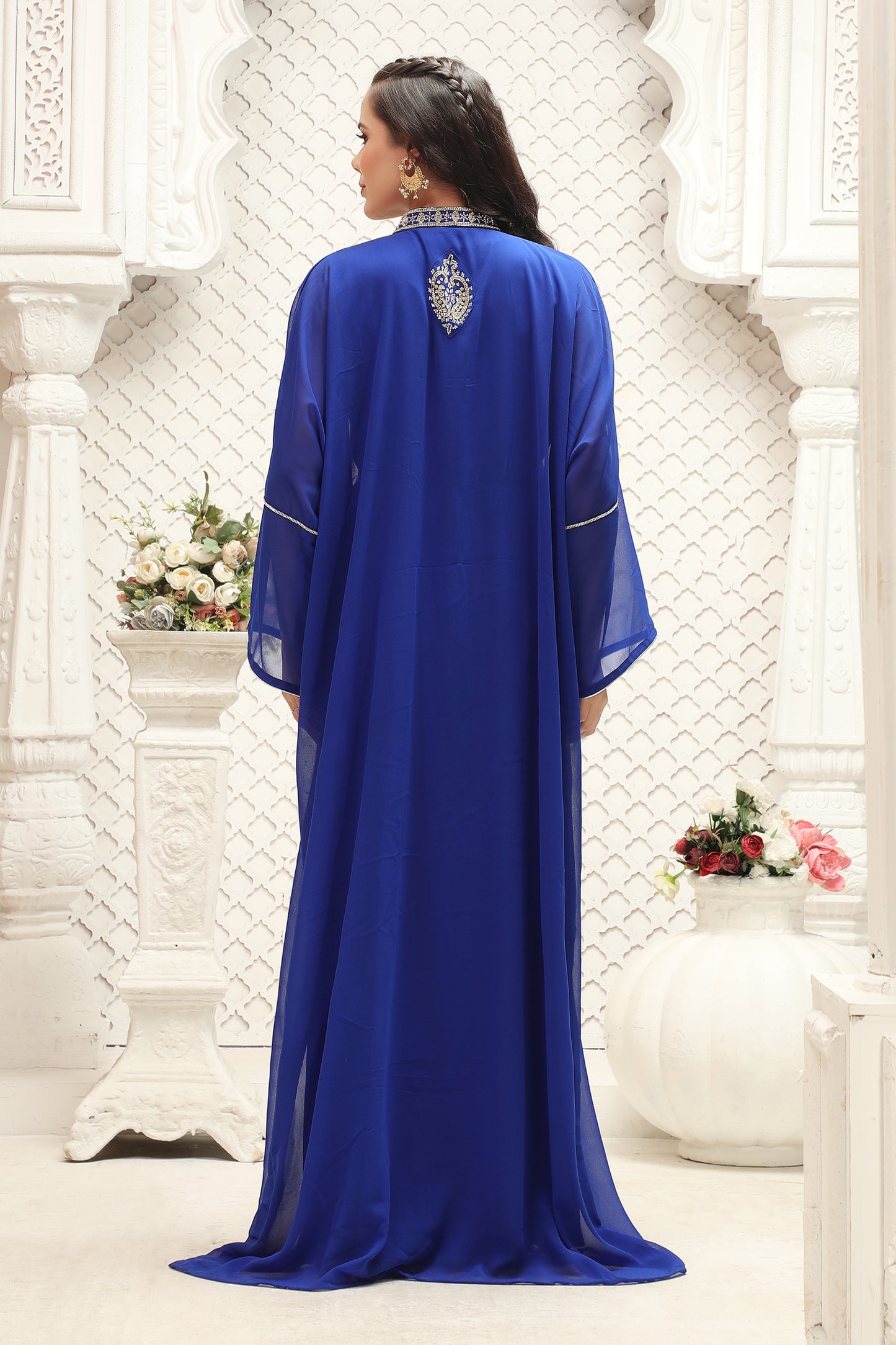 Royal Blue Embroidered Kaftan Gown with Sheer Flowing Sleeves - Maxim Creation