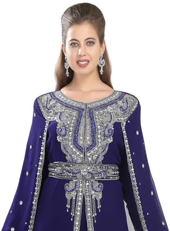 This attention-grabbing elegant kaftan is just right for any event, with the royal blue and silver colour sequins and beads. This hand embroidery attire remains on top in the well-groomed kaftan industry. This navy blue georgette kaftan is a novel maxim creation craft and would be made to order. When it comes to fitness, the XS Size can fit you if you are slim. So, ladies grab your superman look 1 piece set and get a free belt to team up with this full sleeves attire. |