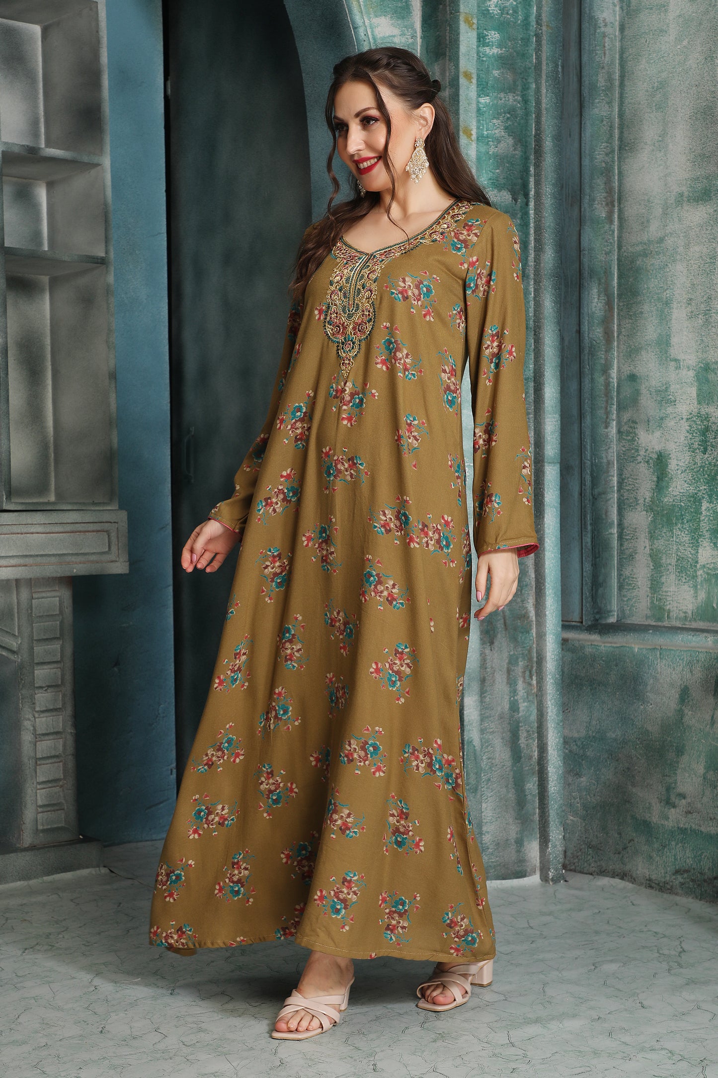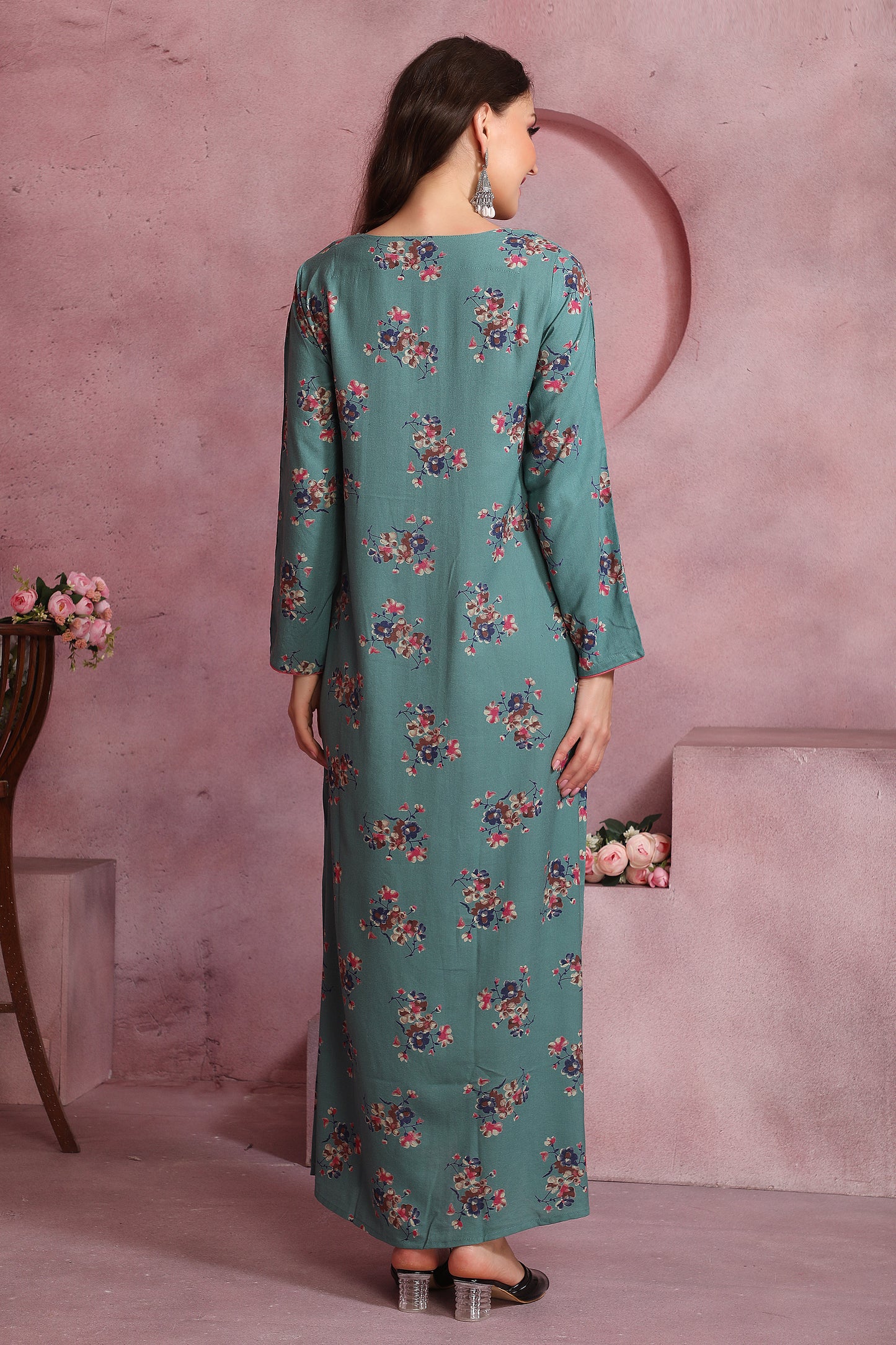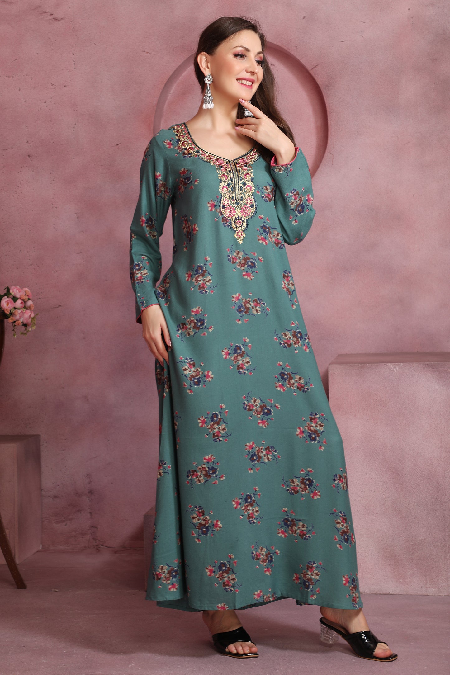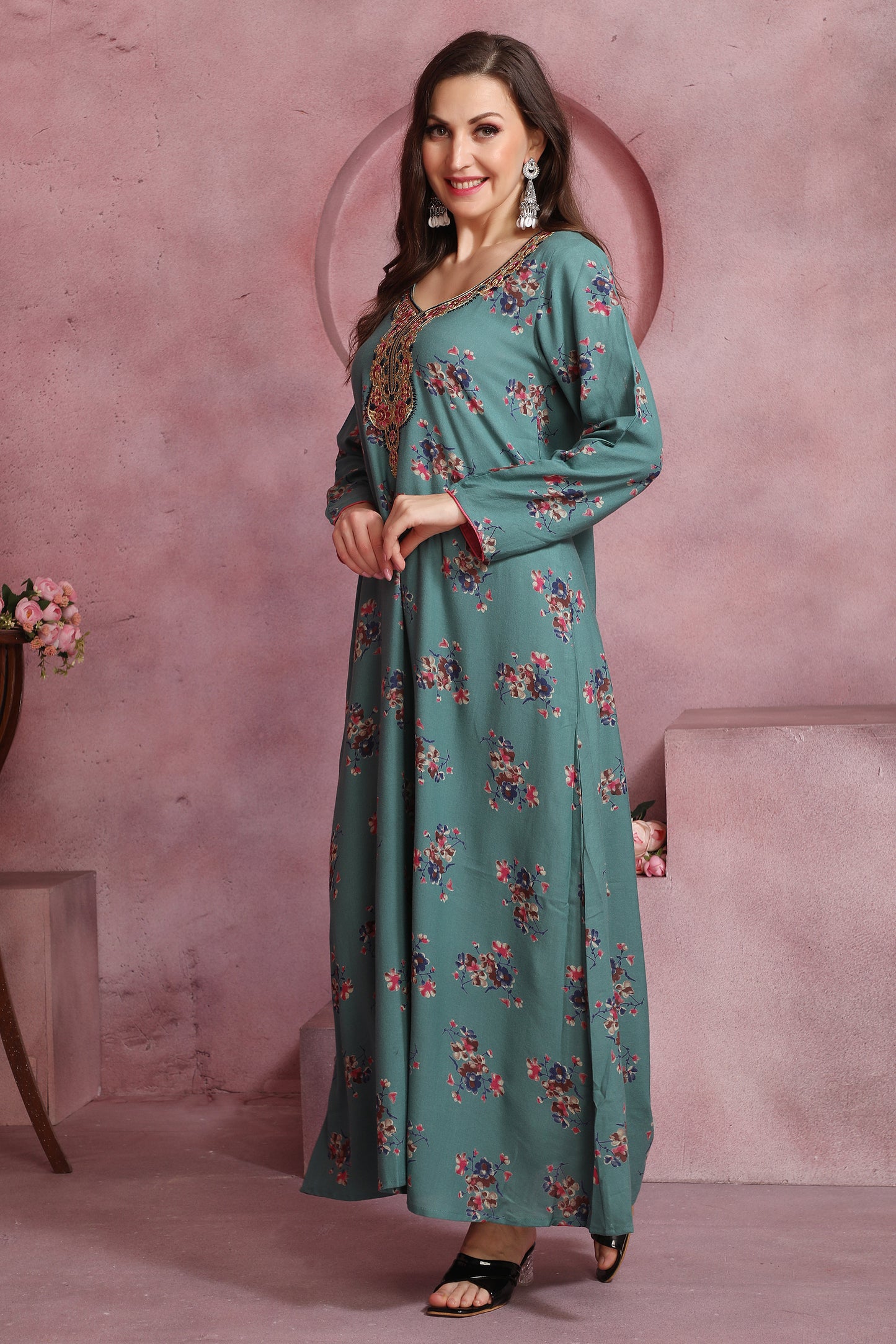 Teal Blue Alpine Floral Kaftan with Embroidered Neckline