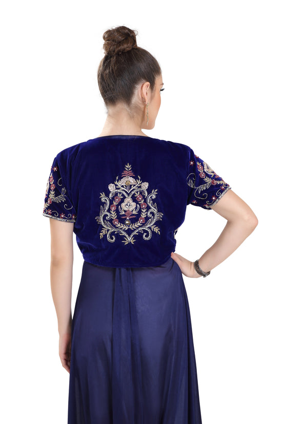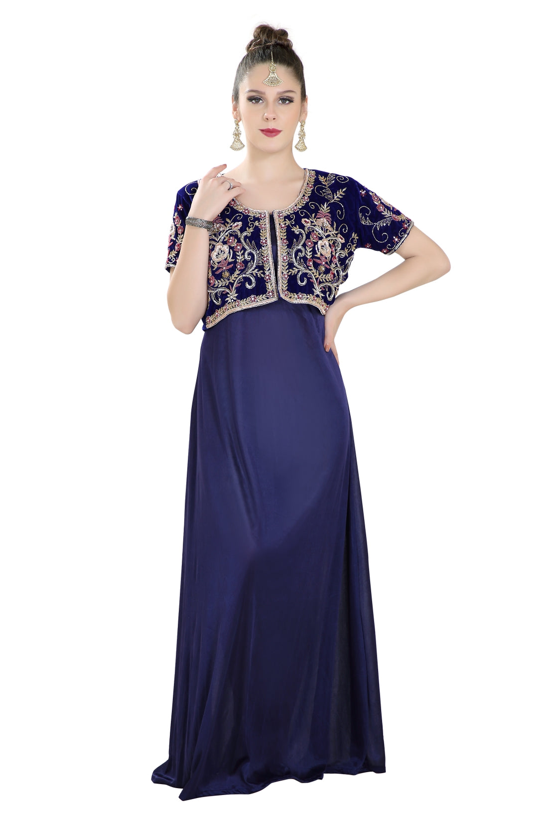 This mix colour beads and sequins hand embroidery will glitter up your occasion. This navy blue colour jacket velvet & inner satin fabric kaftan dress is 2 piece set & short sleeve dress (This Dress Is Lined from the Inside). This charming dress from maxim creation will take your personal style to new heights. With navy blue jacket velvet & inner satin fabric, this outfit comes with multi-colored sequins and beads work with short sleeves giving a kaftan look. Show up to your work event in style by pairing this amazing and luxurious bridal dress. |