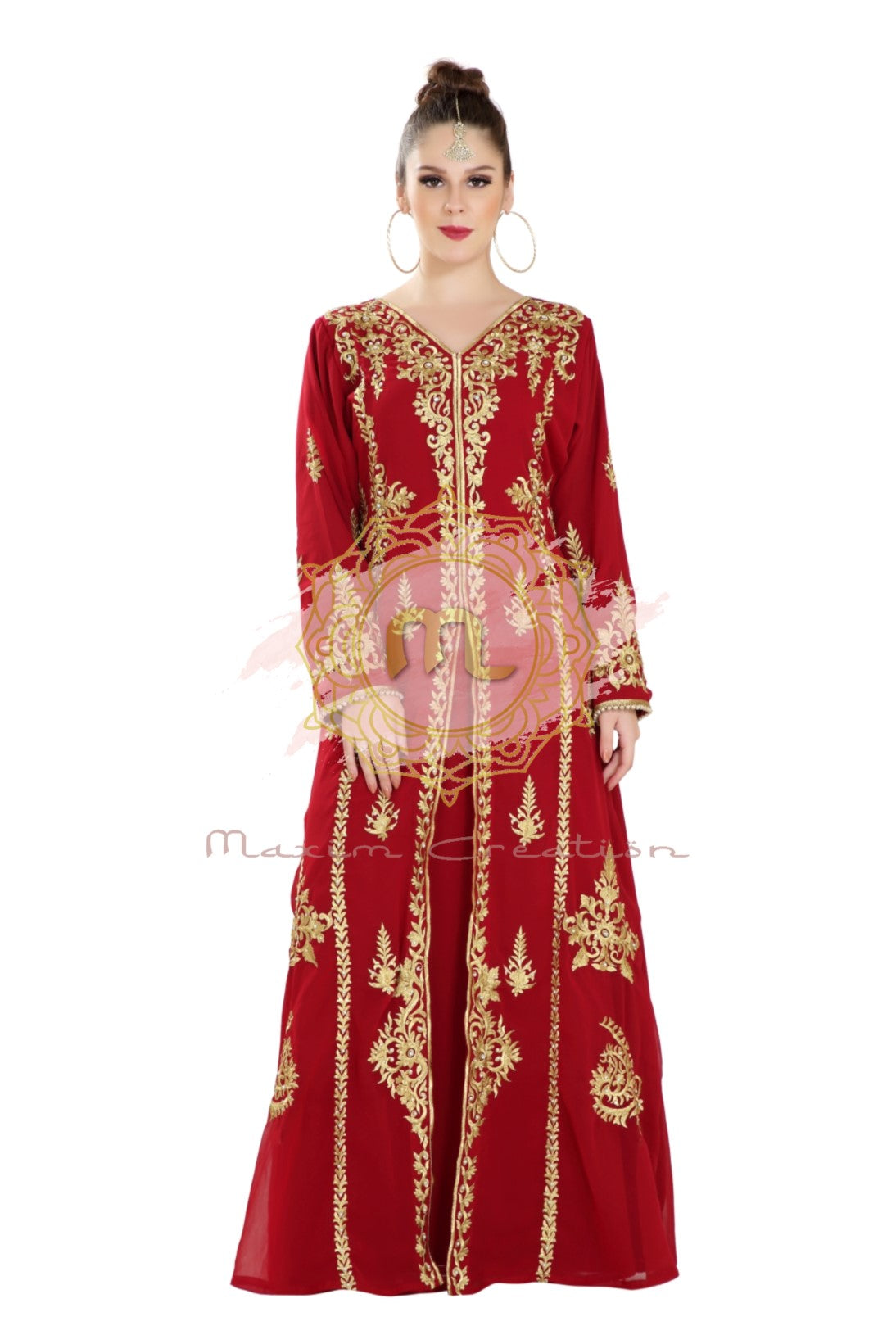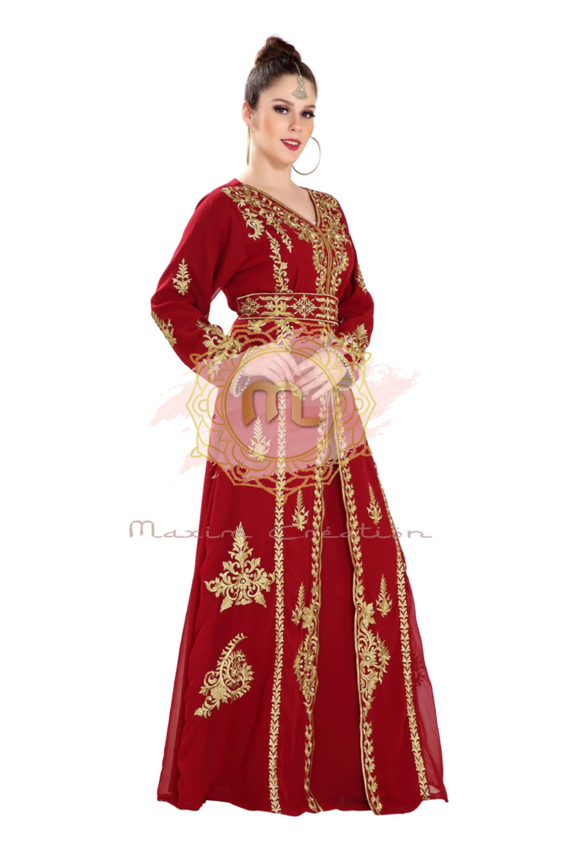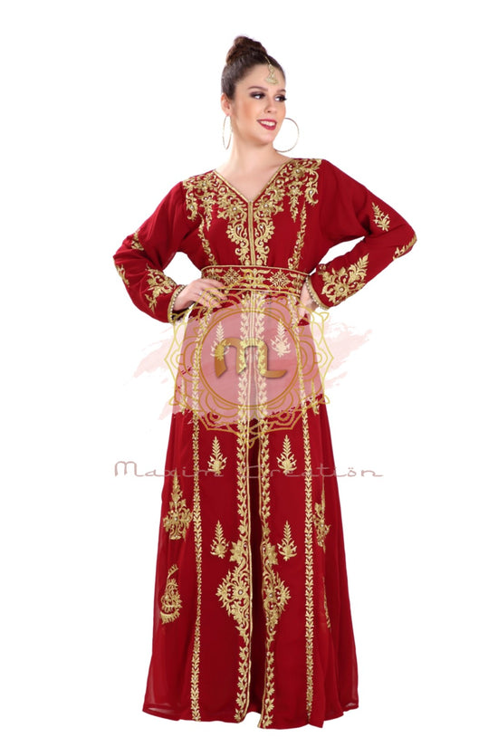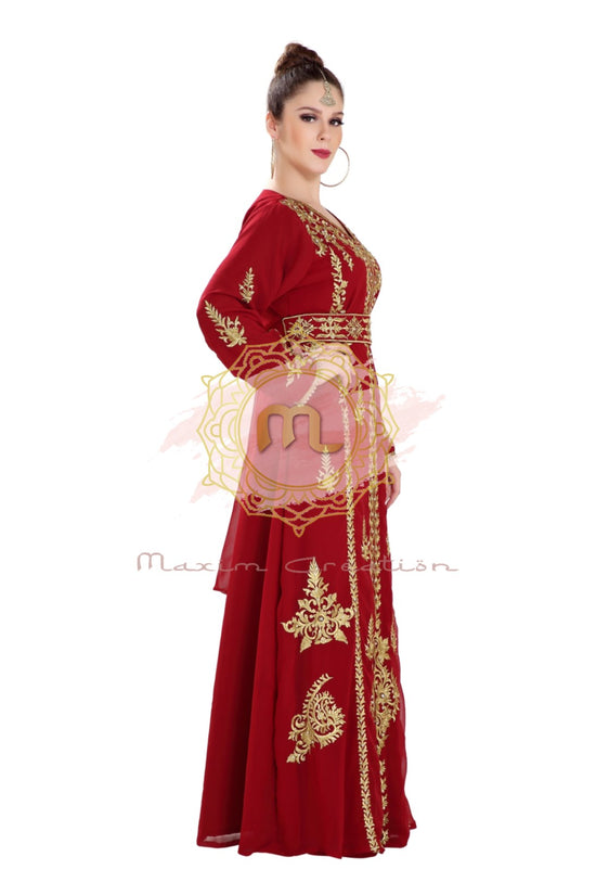 This golden colour beads and sequins ari work machine embroidery will glitter up your occasion. This maroon colour georgette fabric kaftan dress is 2 piece set (with belt) full sleeve dress (This Dress Is Lined from the Inside). This marvellous traditional algerian maroon jabodar from maxim creation is made of georgette, tangled with ari machine embroidery with hand touch sequins and beads. The sleeves are in kaftan style, with full-length lightweight and loose fit. This jabodar is perfect as a splendid cover-up for your attire, or for your next kaftan performance. |