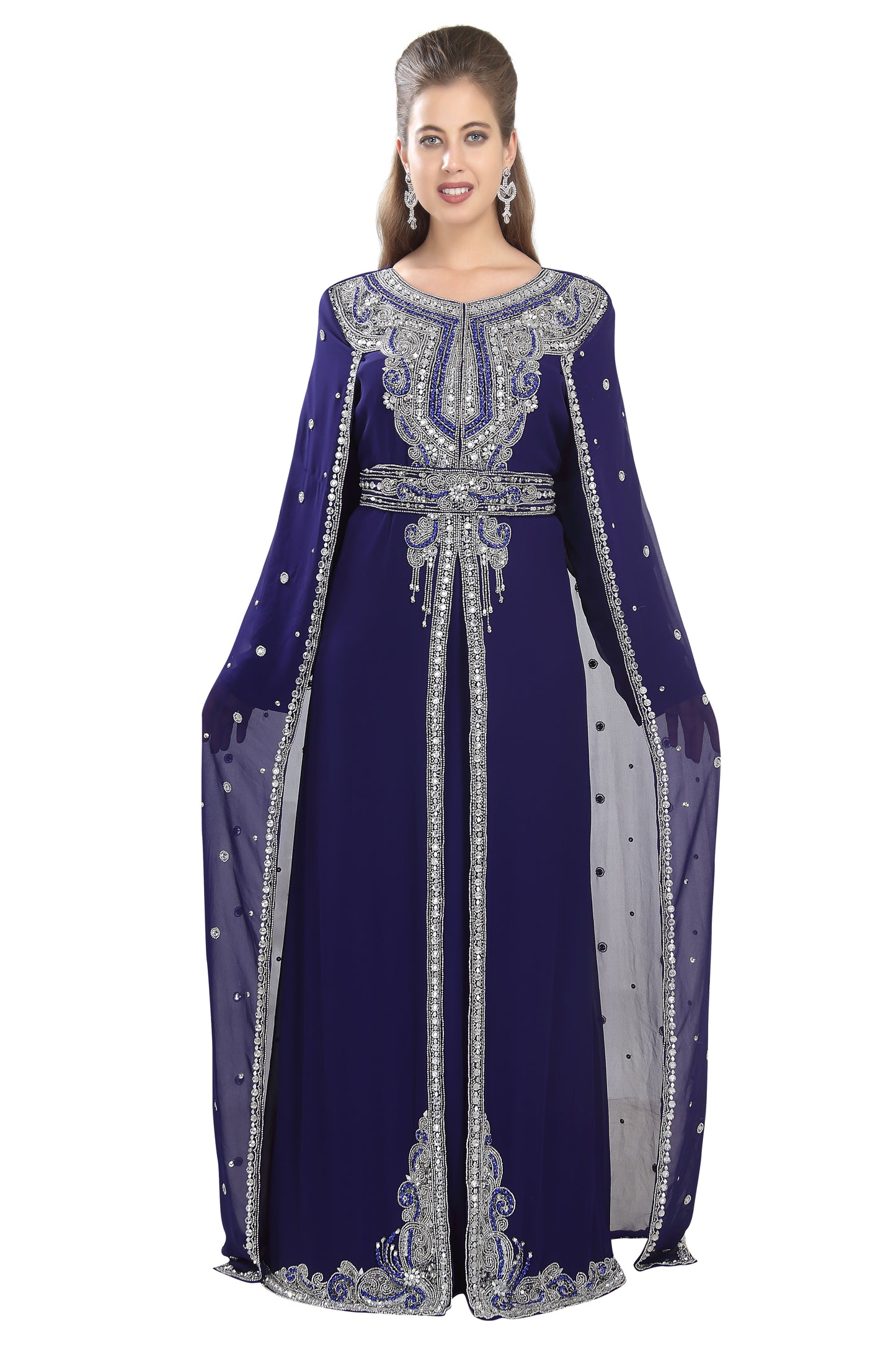 This attention-grabbing elegant kaftan is just right for any event, with the royal blue and silver colour sequins and beads. This hand embroidery attire remains on top in the well-groomed kaftan industry. This navy blue georgette kaftan is a novel maxim creation craft and would be made to order. When it comes to fitness, the XS Size can fit you if you are slim. So, ladies grab your superman look 1 piece set and get a free belt to team up with this full sleeves attire. |