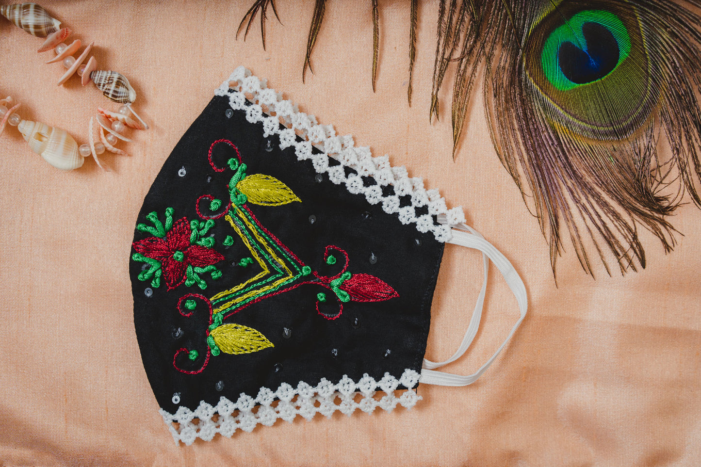 Black Cotton Lace Face Mask with Floral Thread Embroidery