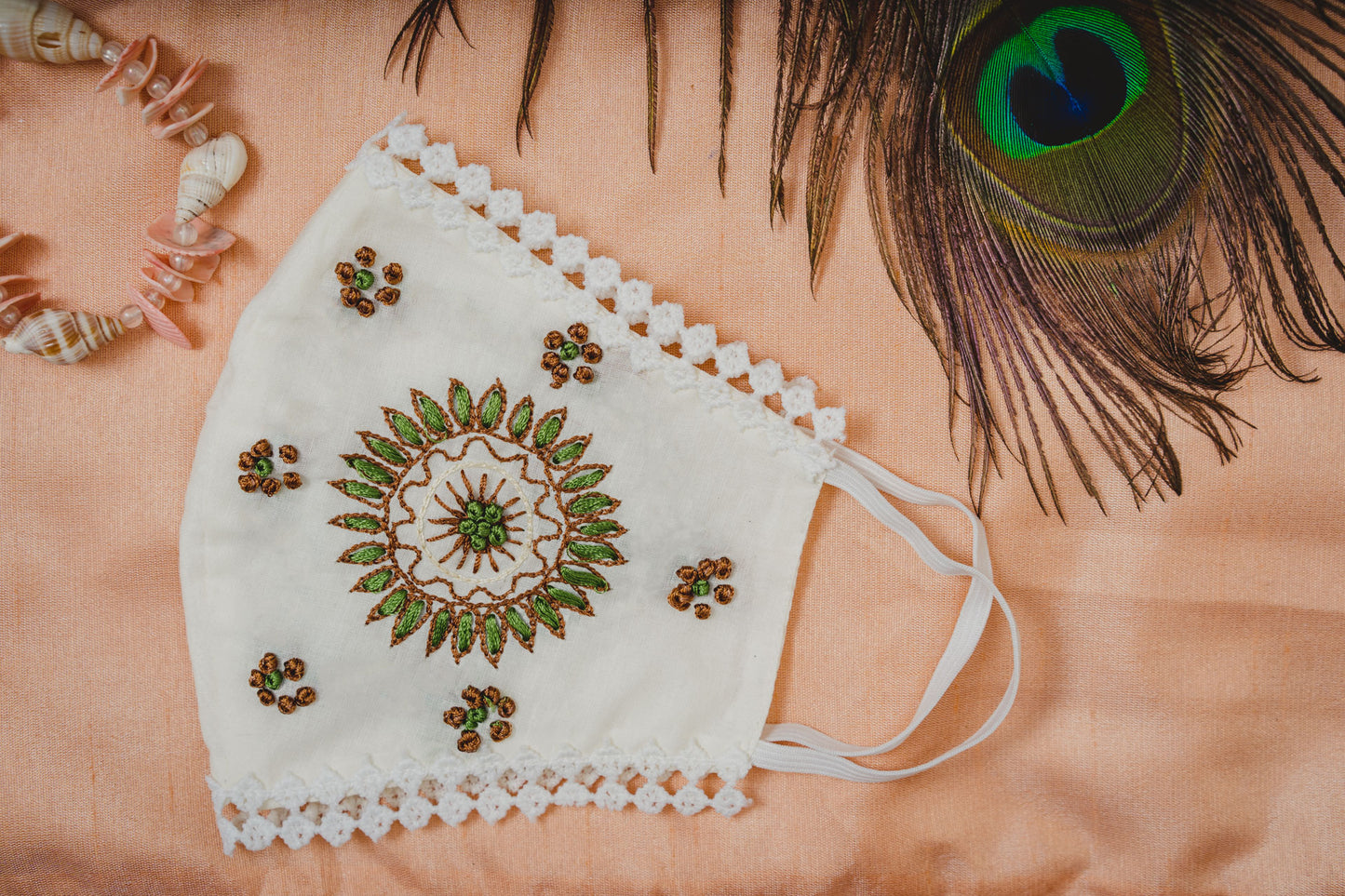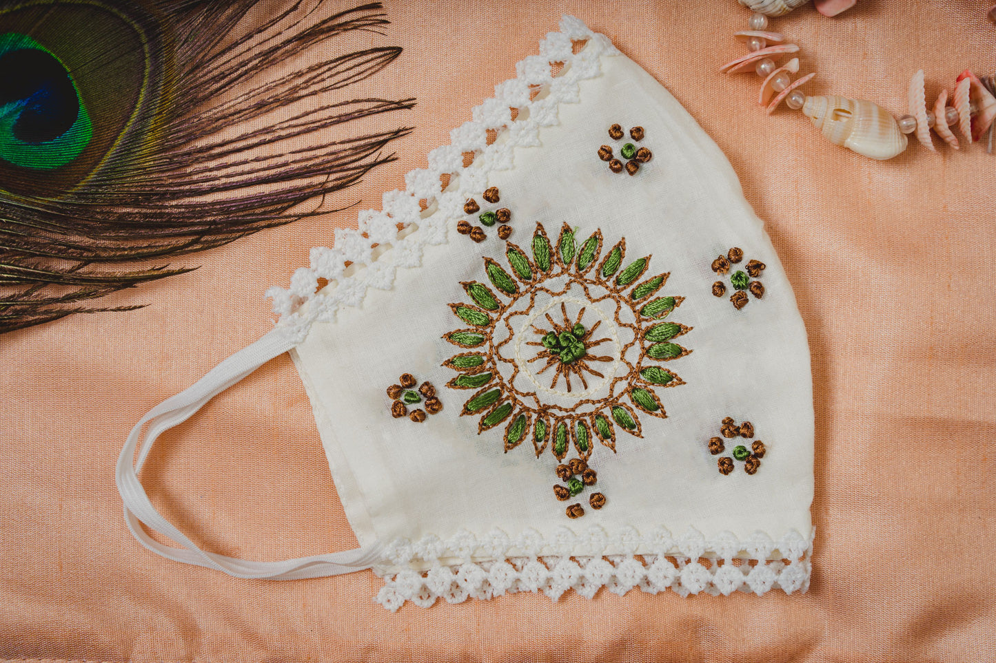 Cream Cotton Lace Face Mask with Sun Flower Embroidery - Maxim Creation