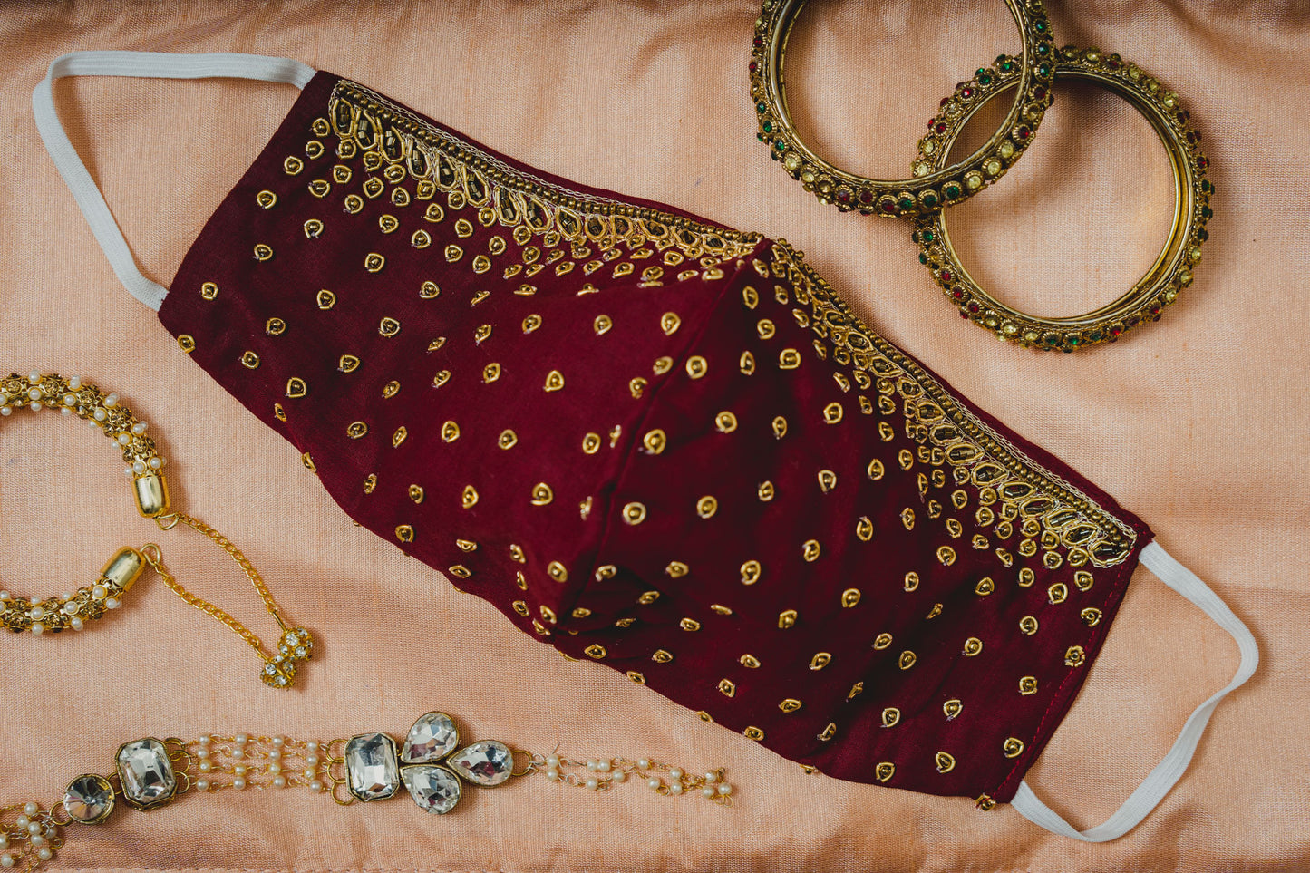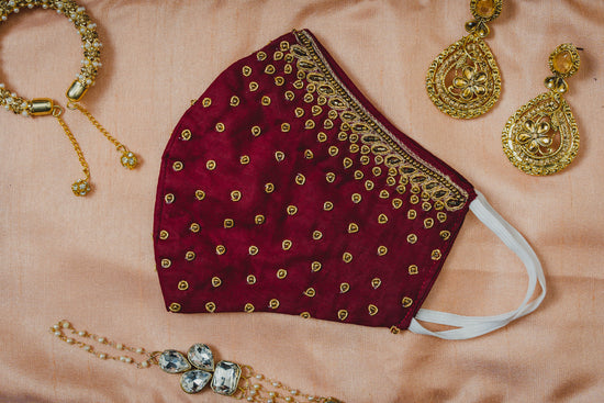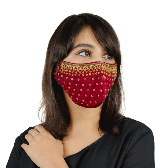 Red coloured Face Mask with Golden Bugle Embroidery Bead. Best for fashion and at the same time protection! Maxim Creation keeps safety as a first priority with unique and fashionably hand crafted designs. This timeless and luxurious piece face mask is perfect for family functions and parties or wedding occasion and casual wear. |