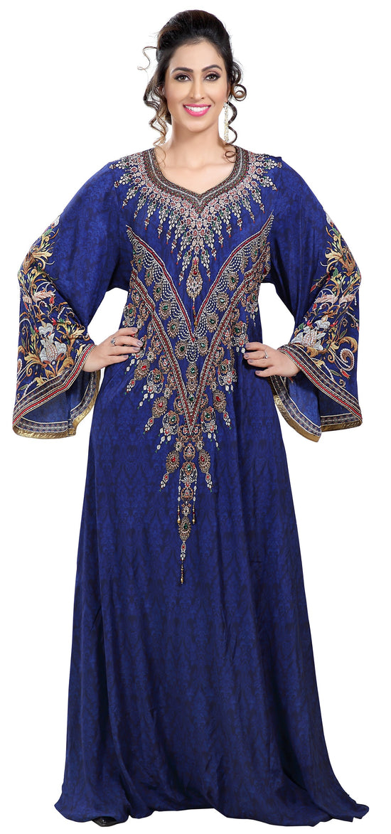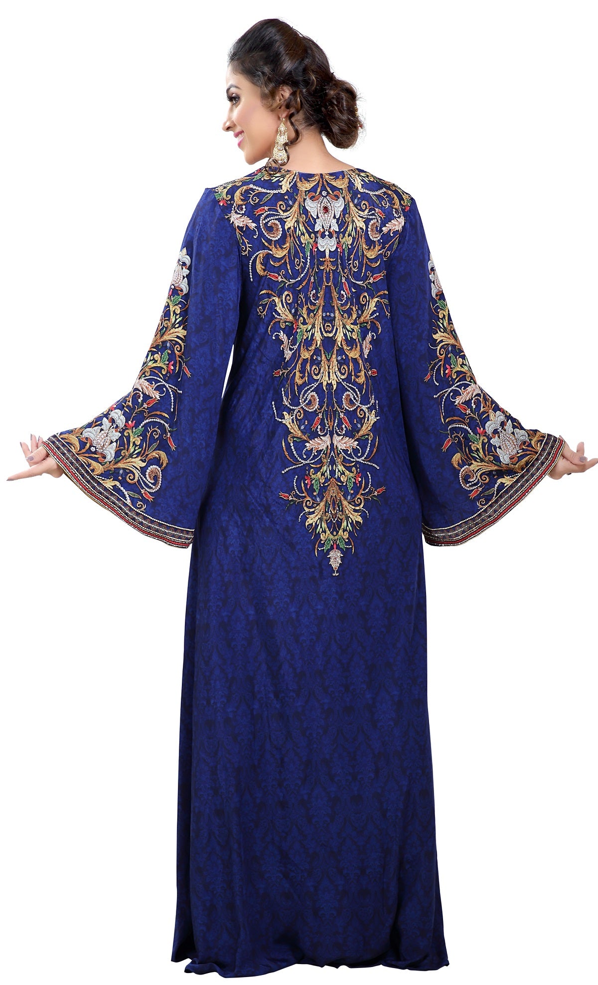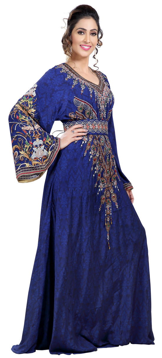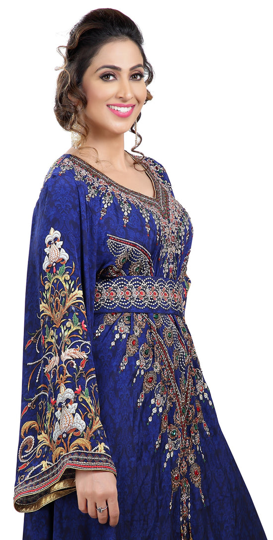 Royal Blue Arabian Digital Print Kaftan With Embroidered Belt