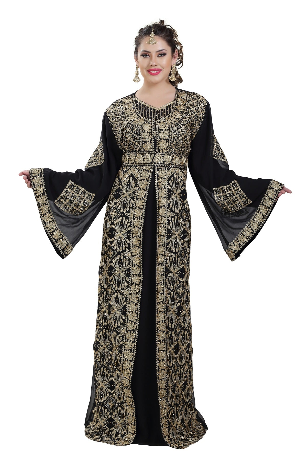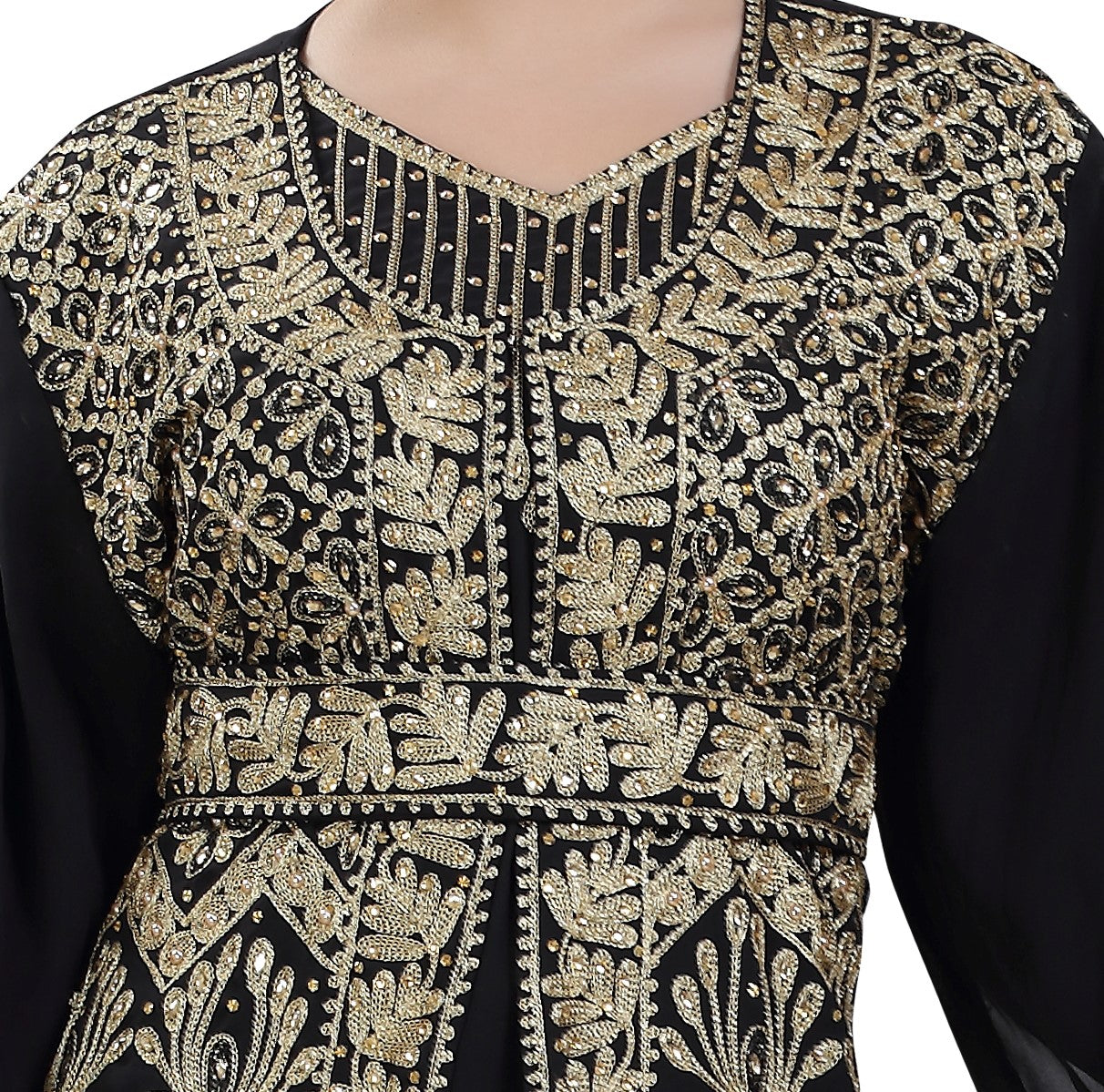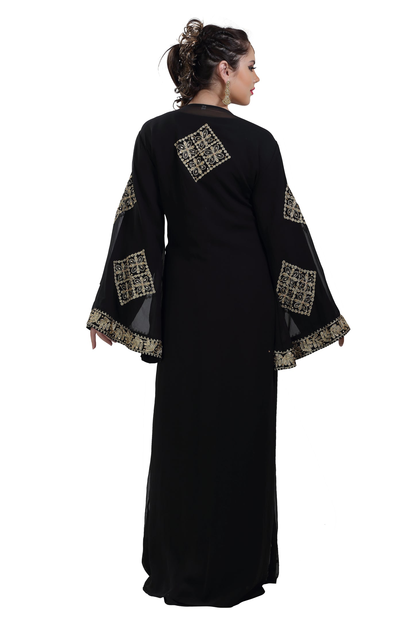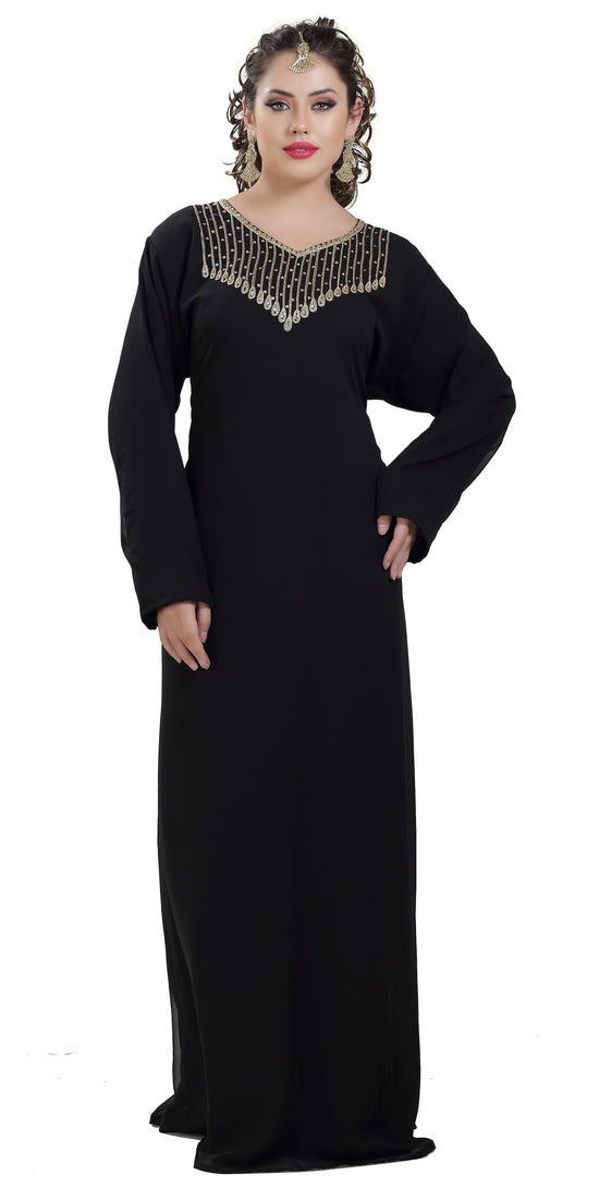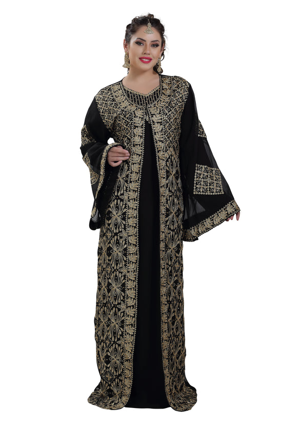 This marvelous traditional algerian black khaleeji thobe from Maxim Creation which is made of georgette, tangled with ari machine embroidery with hand touch sequins and beads. The sleeves are in kaftan style, with full-length lightweight and loose fit. This walima gown is perfect as a splendid cover-up for your attire, or for your next khaleeji performance. This dress is 2 piece set & full sleeve dress (this dress is lined from the inside) |