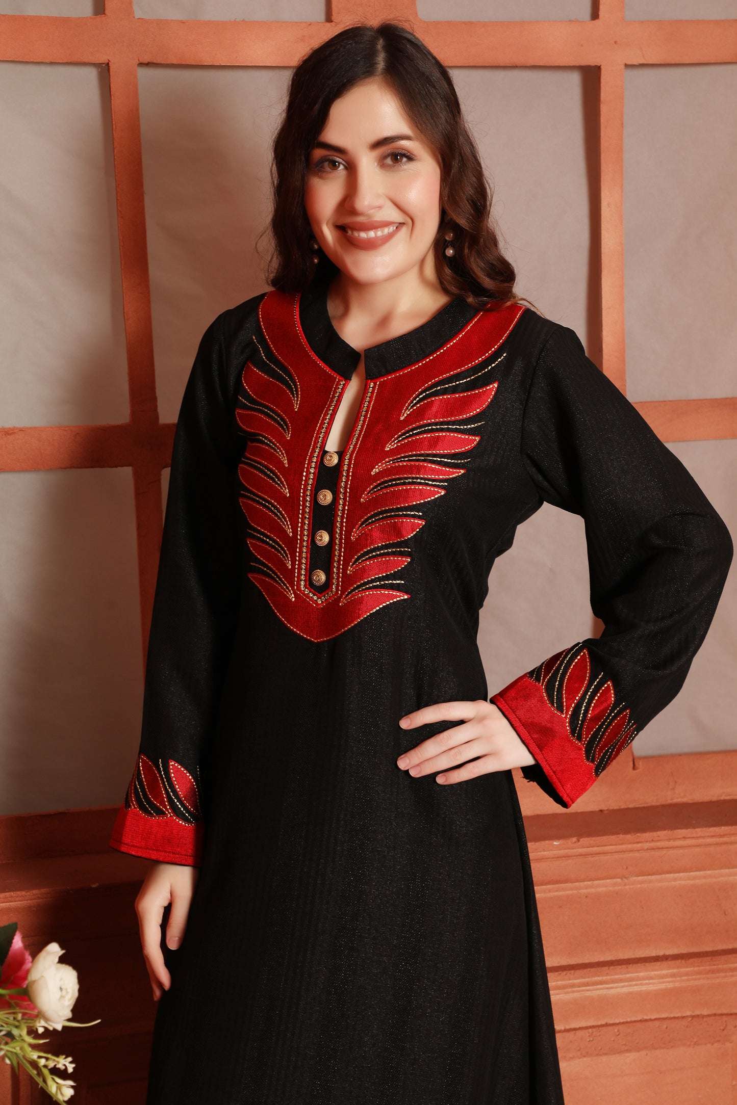 Black Kashmiri Embroidered Feather-Motif Kaftan |